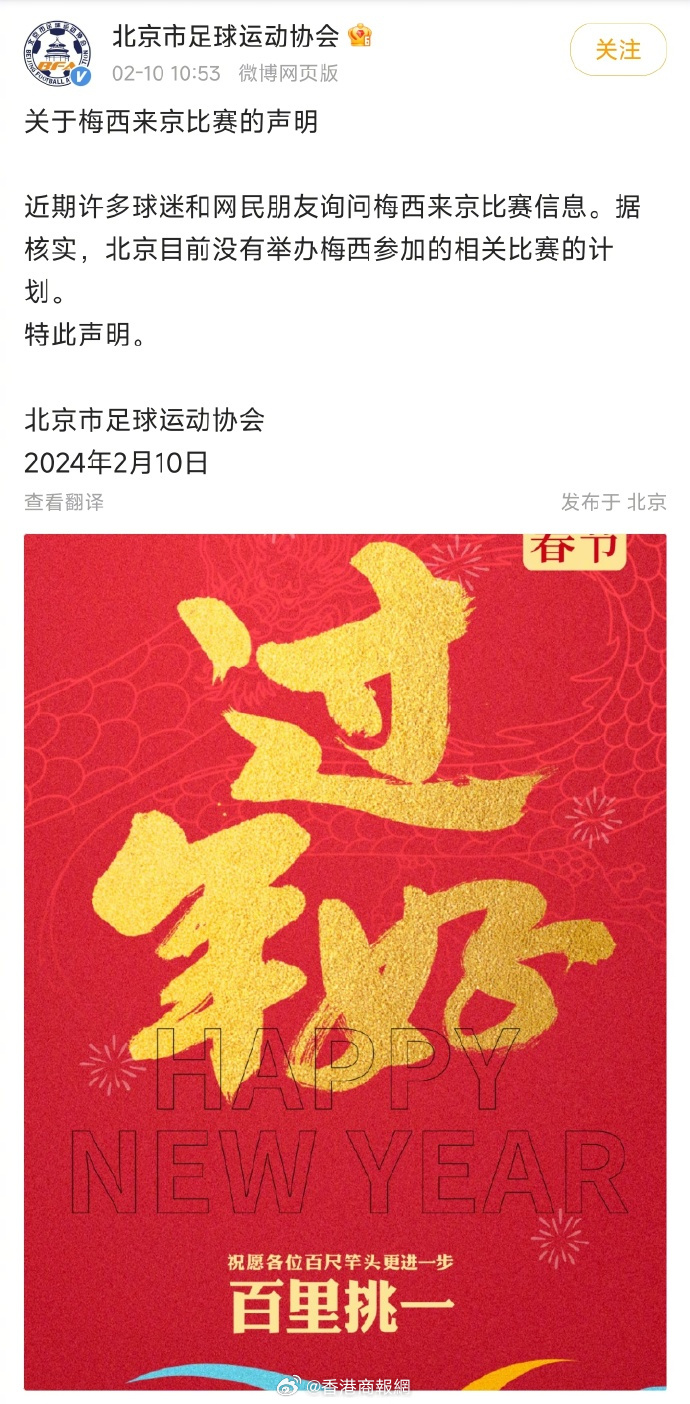 北京市足球運動協(xié)會今日發(fā)布關於梅西來京比賽的聲明,聲明如下:
