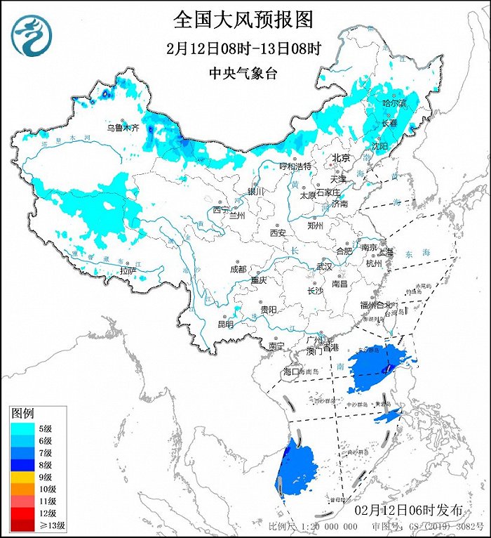 中央氣象臺2月12日06時繼續(xù)發(fā)布大風(fēng)藍(lán)色預(yù)警:預(yù)計,2月12日08時至13日08時,內(nèi)蒙古、黑龍江中西部、吉林中西部和東南部、遼寧、新疆北部、青海西部等地部分地區(qū)有5~6級風(fēng),陣風(fēng)7~8級,其中,新疆北部局地有7~8級風(fēng),陣風(fēng)9級。南海東北部和西南部的部分海域有7~8級風(fēng),陣風(fēng)9級。