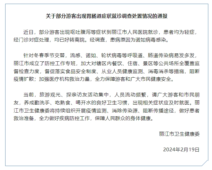 2月19日,麗江市衛(wèi)生健康委在其官微發(fā)布《關(guān)於部分遊客出現(xiàn)胃腸道癥狀就診調(diào)查處置情況的通報(bào)》: