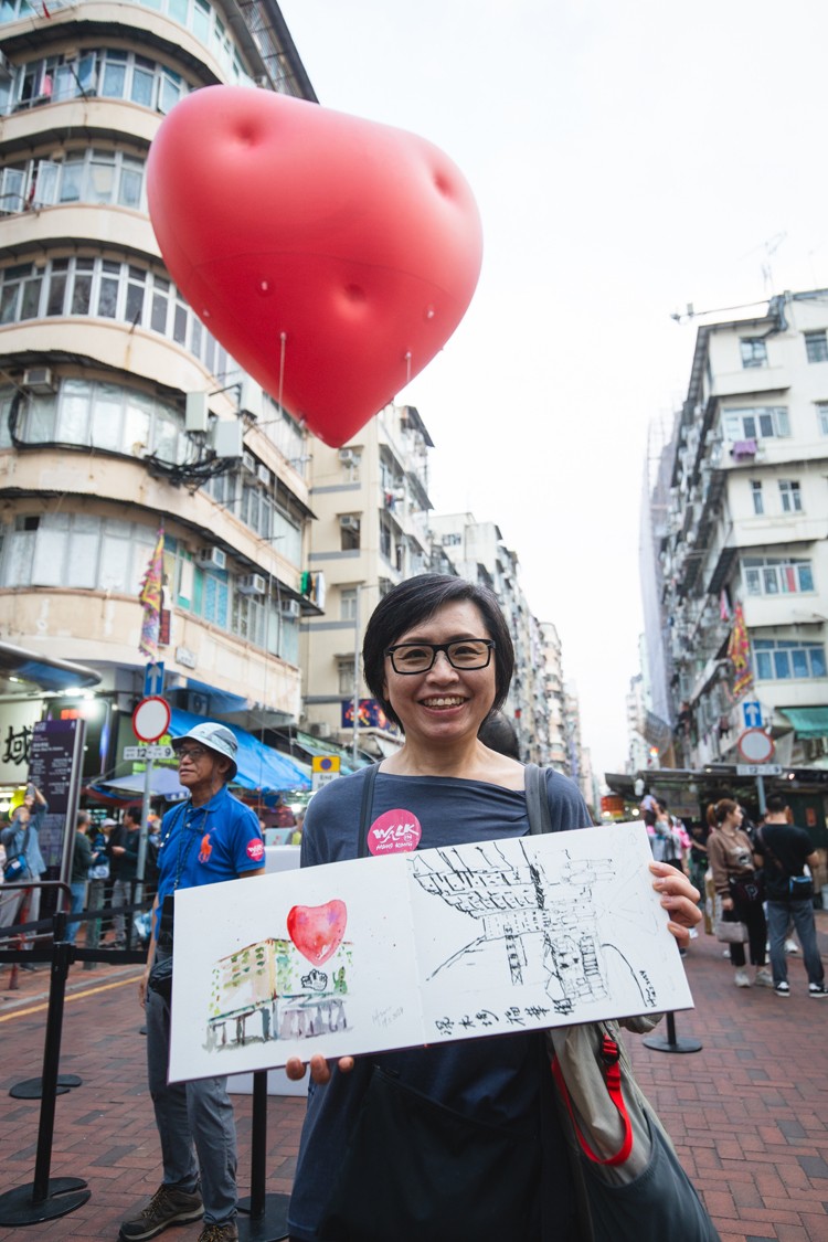 巨型紅心今日(19日)「快閃」深水埗桂林街,而首團(tuán)「快閃追心團(tuán)」則邀請城市寫生團(tuán)隊「畫下嘢」擔(dān)任嘉賓,與20名參加者由福華街出發(fā),介紹區(qū)內(nèi)特色建築與地道特色,雙方亦以飄浮於桂林街的巨型紅心作背景,以城市速畫紀(jì)錄深水埗獨特景觀和風(fēng)貌。