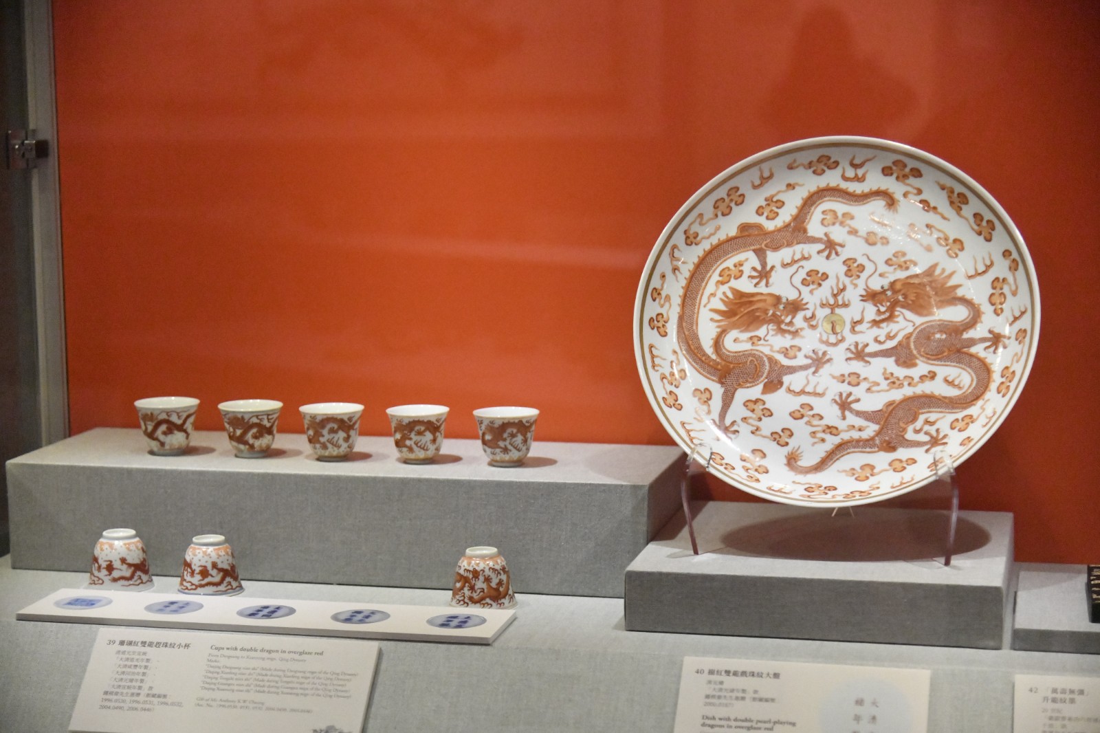 龍的形象有著漫長的演變過程,難以追溯哪位畫家、設計師影響?!覆贿^,清代開始文字記載較多,學者得以從中追溯。如頗得康熙、乾隆帝喜愛的設計師劉源,他筆下的龍手腳筆直,與蜿蜒的身軀形成張力對比,該設計特點同時影響了清代其他龍紋瓷器的製作。這件『藍地黃龍戲珠紋盤』的龍腳筆直,龍身袖長,龍尾捲曲,亦是受到劉源影響?!箵?jù)童宇介紹,清代的展櫃中還展示了不少重點文物,另一件為督陶官唐英自製「墨彩雲(yún)龍紋筆筒」,筆筒上的龍盡顯文人氣息,只用單色繪製,透過乾濕濃淡黑白墨色來表現(xiàn)龍的形態(tài),畫風仿照南宋時期畫家陳容,並有題詩,筆筒詩書畫印於一體,十分雅致。