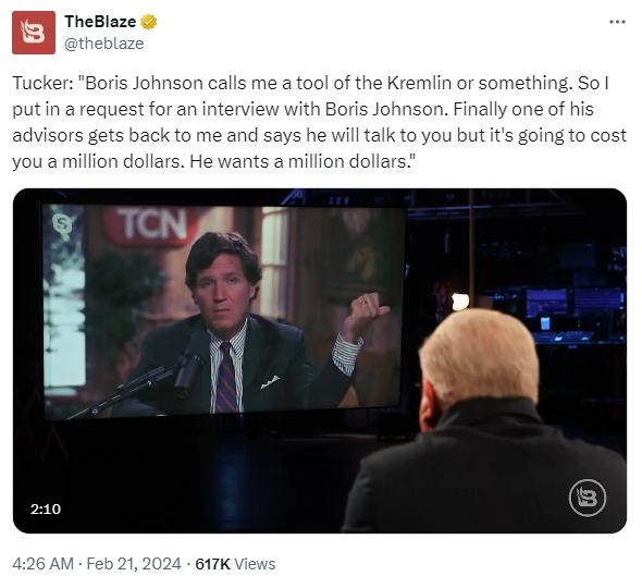 美記者卡爾森爆料:英前首相約翰遜採(cǎi)訪要價(jià)100萬(wàn)美元!