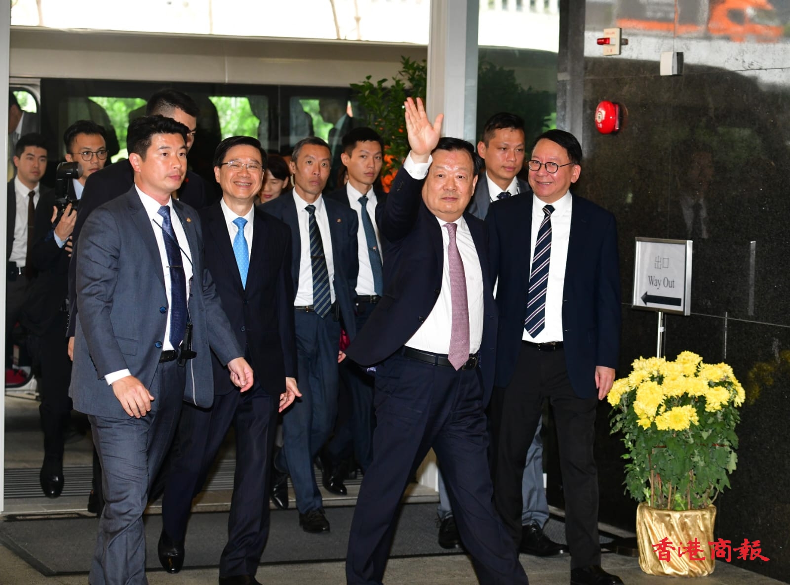 下午近2時(shí)抵達(dá)政府總部,夏寶龍下車後向在場傳媒表示「大家好」,之後在李家超及陳國基等官員陪同下,進(jìn)入政府總部大樓,與李家超率領(lǐng)的特區(qū)政府全體主要官員及常任秘書長進(jìn)行了座談交流。