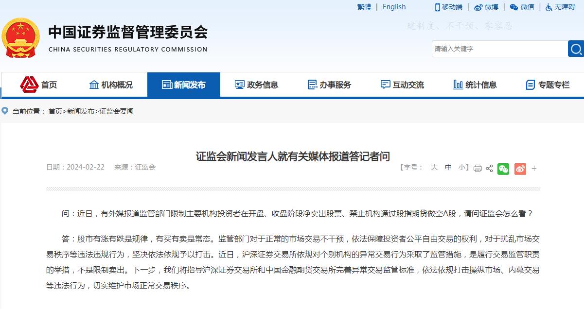 有記者問:近日,有外媒報道監(jiān)管部門限制主要機構(gòu)投資者在開盤、收盤階段淨賣出股票、禁止機構(gòu)通過股指期貨做空A股,請問證監(jiān)會怎麼看?