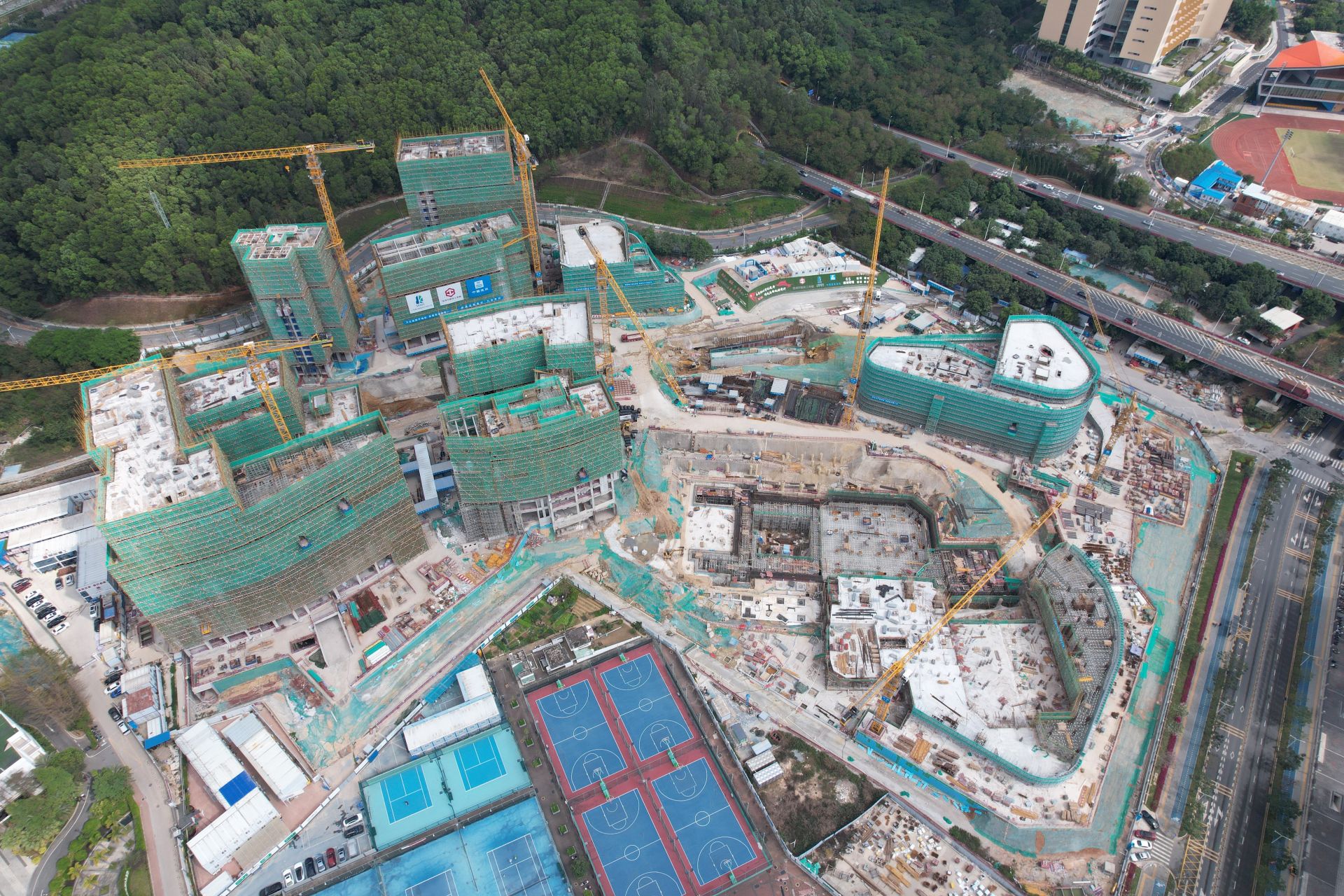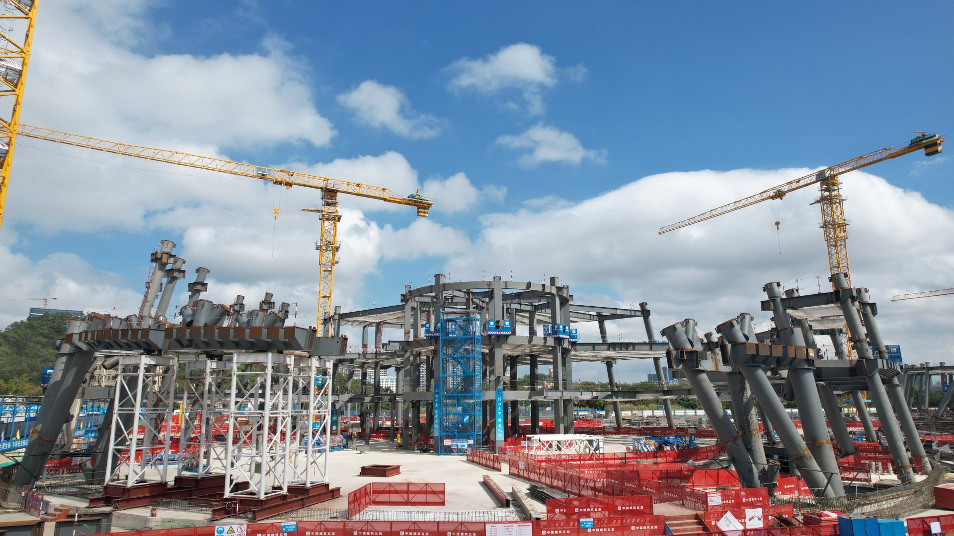 在深圳音樂學院項目建設現(xiàn)場,塔吊等大型機械忙碌不停,工程車輛來回穿梭,鋼筋綁紮、混凝土澆築等快速推進,建設者們幹勁十足。