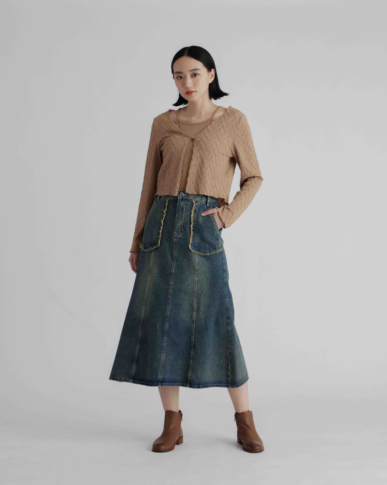 Jacquard Cardigan Twin Set(上身),有米白及淺啡選擇,HK$299。Frayed Denim Mermaid Skirt(下身),有深藍及淺藍選擇,HK$599。