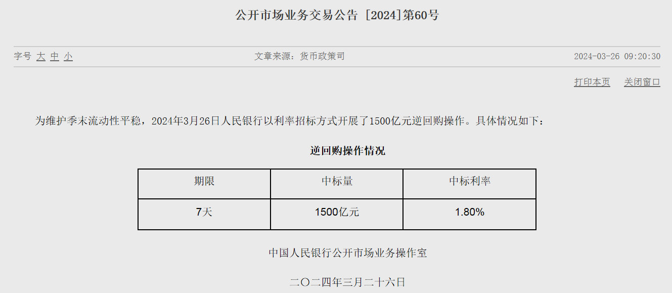 央行網(wǎng)站消息,為維護季末流動性平穩(wěn),3月26日人民銀行開展1500億元7天期逆回購操作,利率與此前持平。