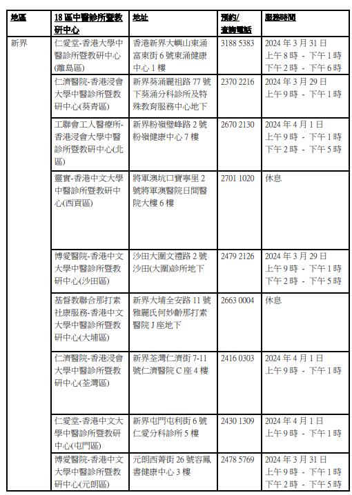復(fù)活節(jié)公眾假期期間(3月29日至4月1日)應(yīng)診的中醫(yī)診所名單及服務(wù)時間。