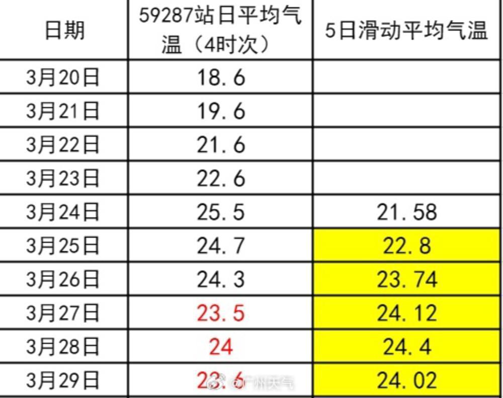 根據(jù)廣州市氣象部門監(jiān)測,廣州國家基本氣象站在2024年3月23日錄得日平均氣溫22.6℃,此後的3月24日至29日該站日平均氣溫均在22℃以上。