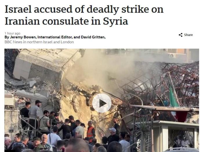 報道援引伊朗駐敘利亞大使侯賽因·阿克巴里的話稱,伊朗大使館旁邊的領事部門建築「遭到以色列F-35戰(zhàn)機發(fā)射的六枚導彈襲擊」。伊朗媒體發(fā)布的視頻還顯示,現(xiàn)場遭到嚴重破壞,並起火冒煙。