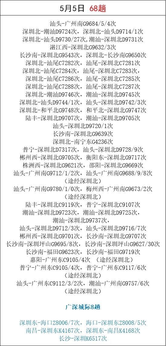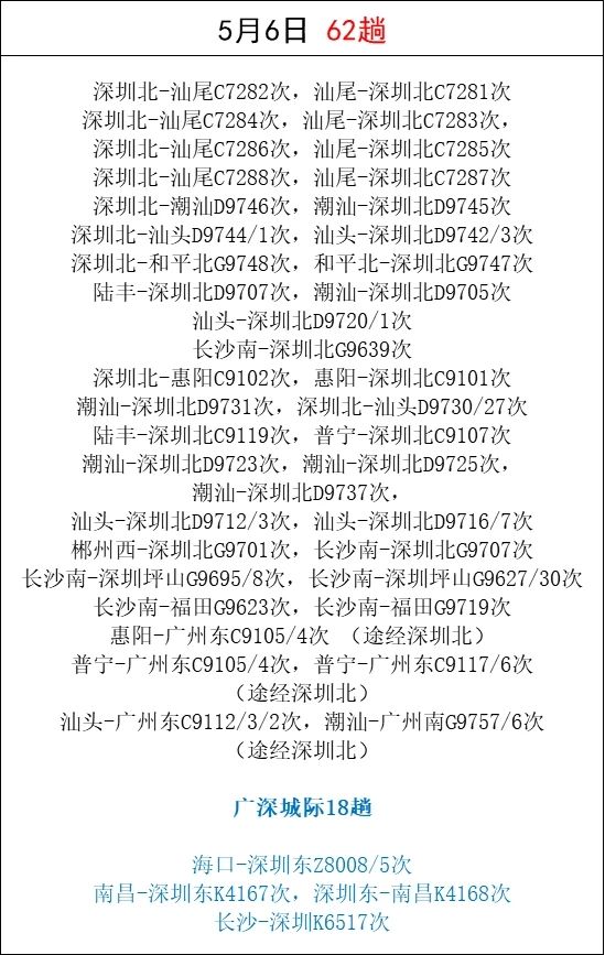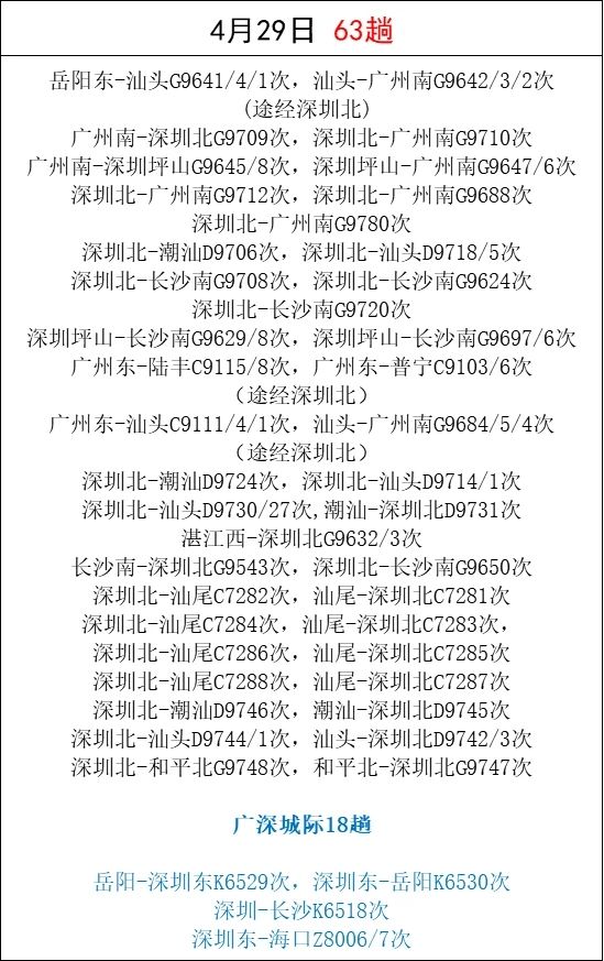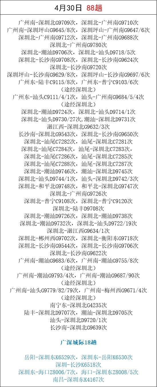 「五一」假期即將來臨,為滿足市民和旅客朋友的出行需求,深圳鐵路根據(jù)鐵路12306候補數(shù)據(jù)和客流特徵,適時加開廣州、汕尾、潮汕、長沙等熱門方向的旅客列車。深圳東站還加開了往返??诘闹边_列車。截至23日16時,加開旅客列車494趟。