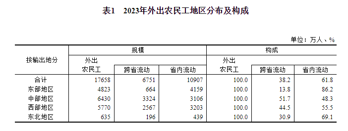 在外出農(nóng)民工中,跨省流動(dòng)6751萬人,佔(zhàn)比38.2%;省內(nèi)流動(dòng)10907萬人,佔(zhàn)比61.8%。分區(qū)域看,東部地區(qū)外出農(nóng)民工中跨省流動(dòng)佔(zhàn)13.8%,中部地區(qū)佔(zhàn)51.7%,西部地區(qū)佔(zhàn)44.5%,東北地區(qū)佔(zhàn)30.9%。