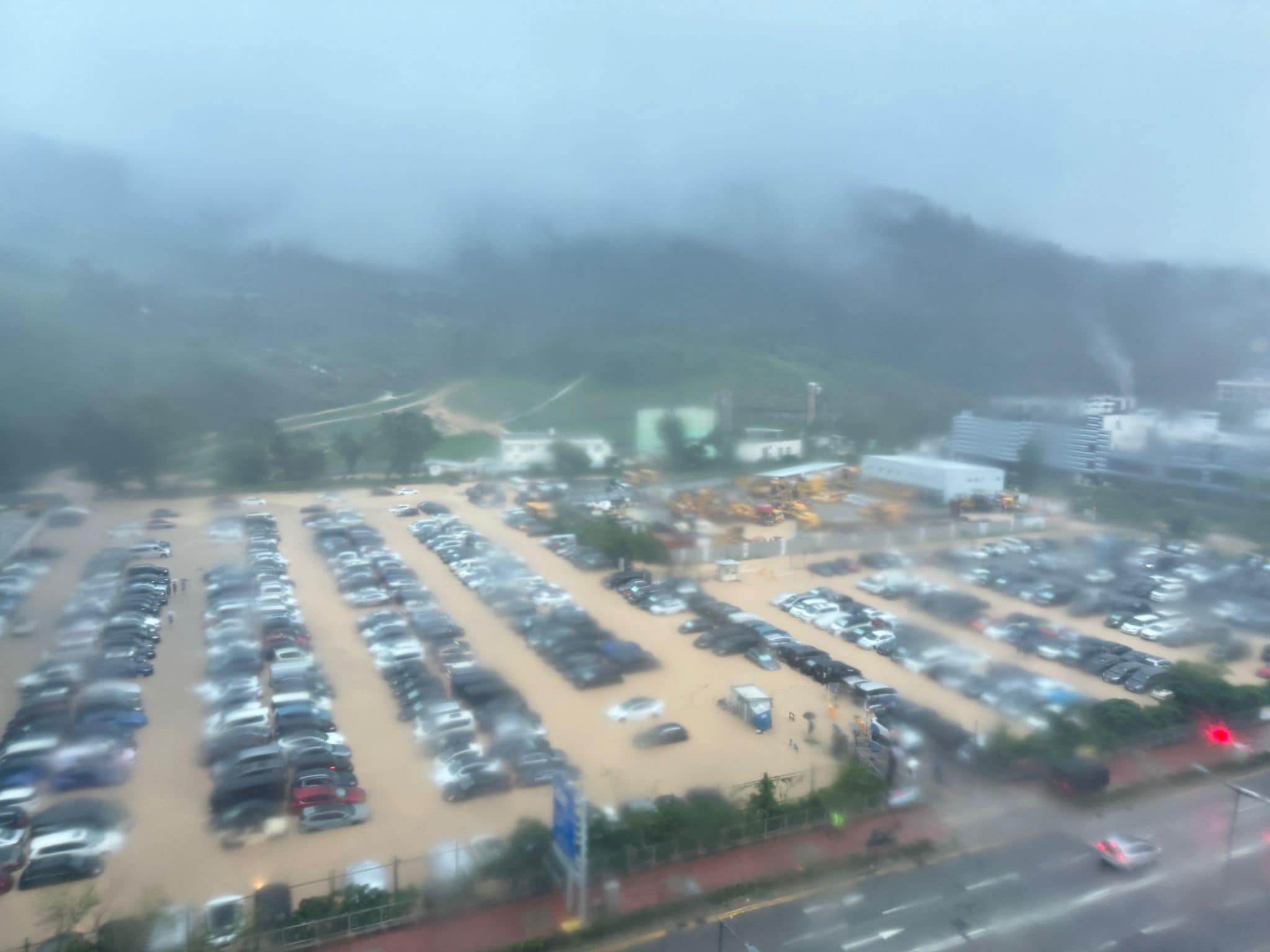 將軍澳環(huán)保大道對(duì)開(kāi)一個(gè)露天停車(chē)場(chǎng),全被黃泥水淹浸,水深達(dá)半架車(chē)。(網(wǎng)上圖片)