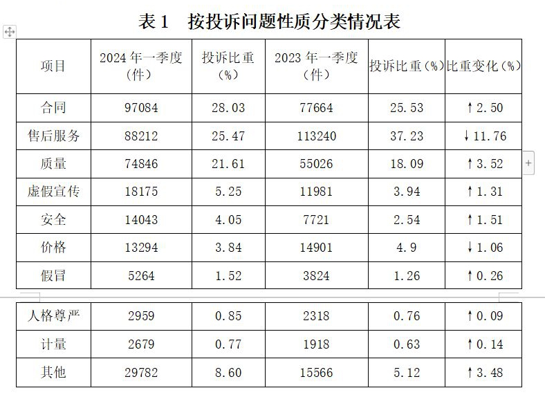根據(jù)投訴性質(zhì),合同問(wèn)題佔(zhàn)28.03%,售後服務(wù)問(wèn)題佔(zhàn)25.47%,質(zhì)量問(wèn)題佔(zhàn)21.61%,其他問(wèn)題佔(zhàn)8.60%,虛假宣傳問(wèn)題佔(zhàn)5.25%,安全問(wèn)題佔(zhàn)4.05%,價(jià)格問(wèn)題佔(zhàn)3.84%,假冒問(wèn)題佔(zhàn)1.52%,人格尊嚴(yán)問(wèn)題佔(zhàn)0.85%,計(jì)量問(wèn)題佔(zhàn)0.77%。