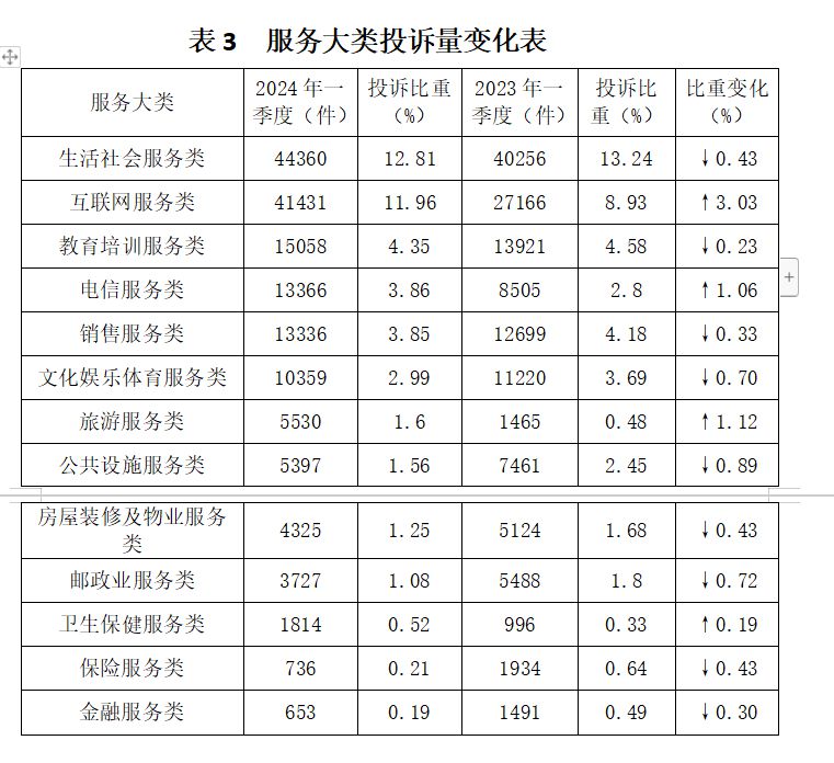根據(jù)2024年一季度服務(wù)大類投訴數(shù)據(jù),生活社會(huì)服務(wù)類、互聯(lián)網(wǎng)服務(wù)類、教育培訓(xùn)服務(wù)類、電信服務(wù)類、銷售服務(wù)類居於前五位。與2023年一季度相比,互聯(lián)網(wǎng)服務(wù)類投訴量比重上升3.03個(gè)百分點(diǎn),公共設(shè)施服務(wù)類投訴量比重下降0.89個(gè)百分點(diǎn)。