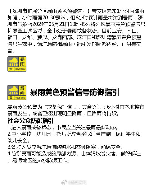 據(jù)深圳市氣象臺消息,寶安區(qū)未來1小時內(nèi)降雨加強,小時雨強20-30毫米,但6小時累計雨量將達到暴雨,深圳市氣象臺2024年05月21日13時45分將分區(qū)暴雨黃色預警信號擴展至上述區(qū)域,全市處於暴雨戒備狀態(tài)。目前寶安、南山、福田、龍華、羅湖、龍崗西部、珠江口和深圳灣暴雨黃色預警信號生效中,請注意防禦暴雨可能引發(fā)的局部內(nèi)澇、山洪等災(zāi)害。