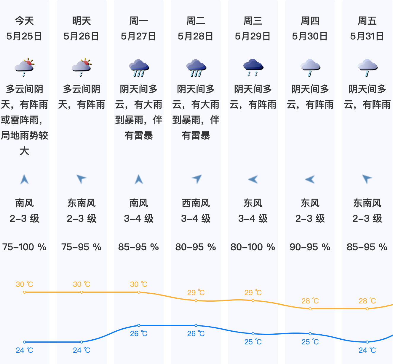 預(yù)計(jì)25-26日陰天間多雲(yún),有間歇性陣雨或雷雨,局地雨勢(shì)較大,25日氣溫24-29℃;