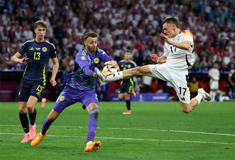 歐洲國家盃於本地時間周六(15日)凌晨3點上演揭幕戰(zhàn),由東道主德國(日耳曼戰(zhàn)車)迎鬥蘇格蘭。日耳曼戰(zhàn)車在這場A組賽事表現(xiàn)鋒芒畢露,在多達19次攻門下,最終以5比1大勝有波迪奧斯領(lǐng)紅出場的蘇格蘭,打響頭炮。