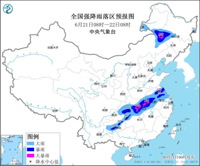 預計,6月21日08時至22日08時,江淮大部、江漢大部、河南南部、湖南北部和西部、重慶東部、貴州西南部和中部以及內(nèi)蒙古東北部、黑龍江西南部和東部、吉林西部等地部分地區(qū)有大到暴雨,其中,湖北東部和南部、安徽西部、江蘇北部、內(nèi)蒙古東北部、吉林西部等地局地有大暴雨(100~180毫米)。上述部分地區(qū)伴有短時強降水(最大小時降雨量30~60毫米,局地可超過80毫米),局地有雷暴大風等強對流天氣。