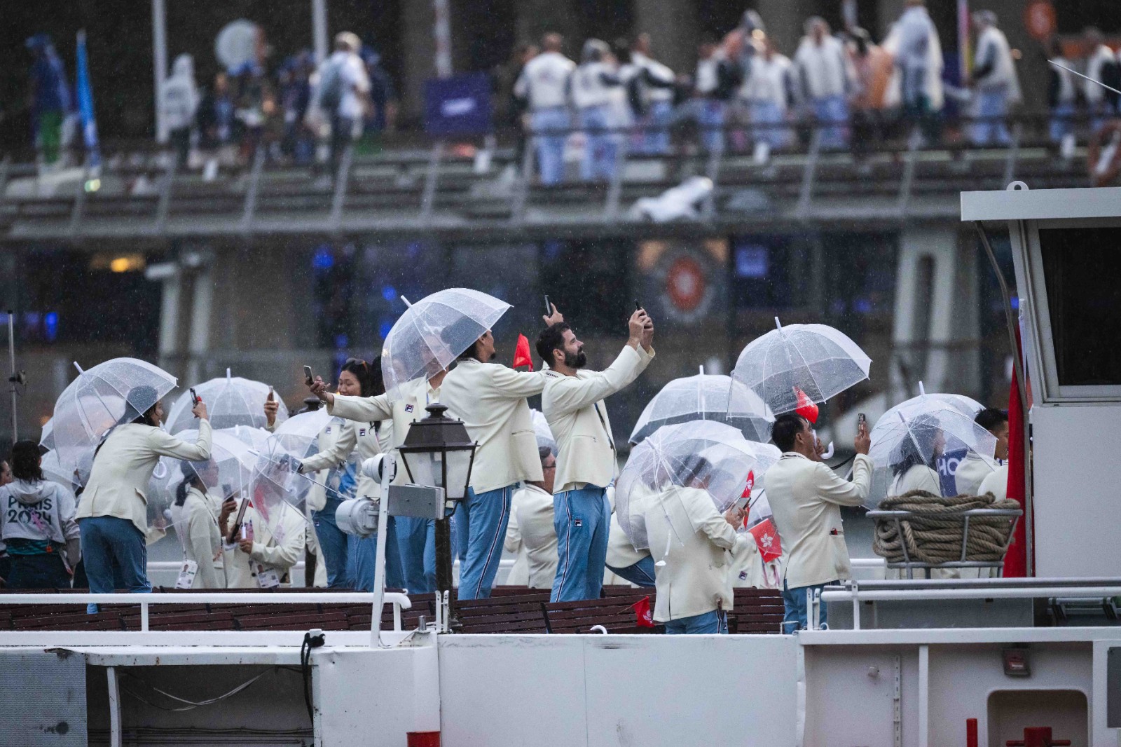 排第82位、乘搭第34號(hào)船出場(chǎng)的中國(guó)香港代表團(tuán),與匈牙利、洪都拉斯同船。港隊(duì)由張家朗(劍擊)和何詩(shī)蓓(游泳)擔(dān)任持旗手,亮相時(shí)正下著大雨,團(tuán)長(zhǎng)施文信博士、運(yùn)動(dòng)員及教練等人在船上都要拿著雨傘。雖然天公不作美,但無(wú)損一眾港將興緻,他們除了自拍(Selfie),還不時(shí)向塞納河兩岸的觀眾比心、揮手示好,場(chǎng)面歡快。