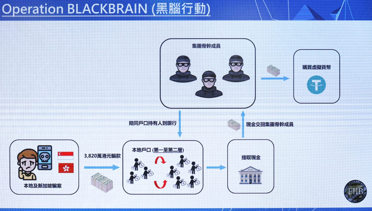財富情報調查科在8月展開代號「黑腦」行動,拘捕集團首腦及骨幹成員等共7人,檢獲約30萬元現金和逾60張銀行卡,成功阻止集團從戶口轉移一部分犯罪得益。被拘捕其中5人已被落案控告「洗黑錢」罪。