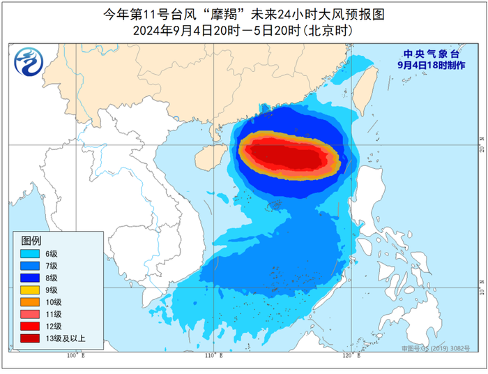 大風預報:9月4日20時至5日20時,臺灣海峽、南海大部、巴士海峽、福建中南部沿海、廣東中東部沿海將有6-8級大風,其中南海北部和中部部分海域及東沙群島附近海域?qū)⒂?-11級大風,「摩羯」中心經(jīng)過的附近海域的風力可達12-16級、陣風17級以上。