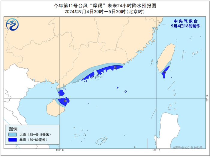 9月4日20時至5日20時,臺灣島東南部、廣東南部沿海、海南島東北部等地將有大到暴雨(50-80毫米)。