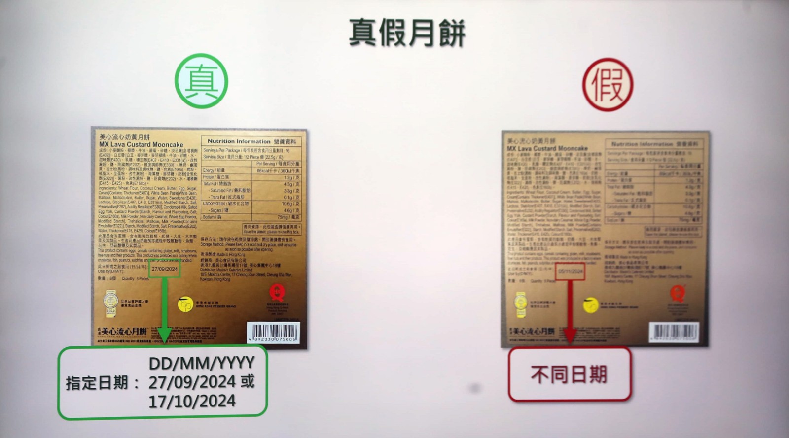廖聞晉說,檢獲的冒牌月餅涉及多個(gè)品牌,其中一個(gè)品牌主要售賣皮具和時(shí)裝,根據(jù)商標(biāo)持有人資料,並沒有設(shè)計(jì)和生產(chǎn)月餅及餐具,該品牌的冒牌月餅網(wǎng)上售價(jià)600至800元。另一個(gè)品牌的冒牌月餅抄襲正貨包裝盒的外觀設(shè)計(jì)和註冊(cè)商標(biāo),正貨印有「Magical」字樣,冒牌側(cè)串法錯(cuò)誤,將「Magical」中的「c」寫錯(cuò)作「e」。正貨包裝盒側(cè)面凹凸文細(xì)緻,冒牌則有明顯分別;正貨日期食用日期是2024年9月27日或2024年10月17日或之前,冒牌最佳食用日期則有不同日子。