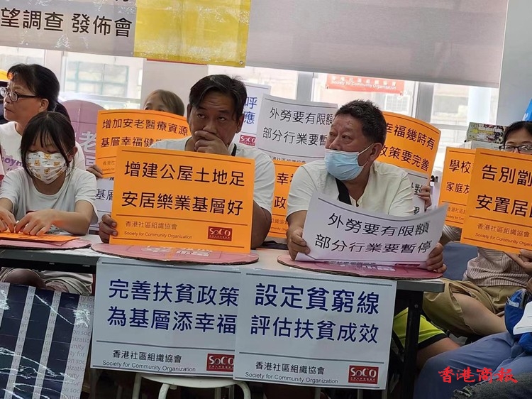 頂圖圖説:香港社區(qū)組織協(xié)會今早召開記者會,公布基層市民對特區(qū)政府過去兩年施政評分,及新一份《施政報告》的期望。(記者 葉家亨攝)