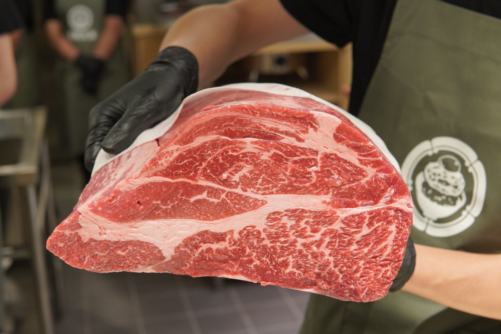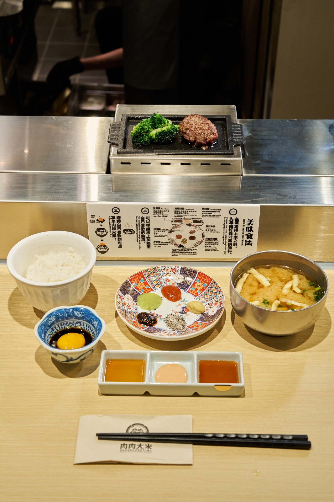 餐廳設(shè)有約40個吧臺座位和開放式廚房,食客可近距離親睹漢堡排的烤製,在入口處的透明窗內(nèi)則可看到店員將切割牛肉、免治並搓成漢堡排的過程,另一旁放置精米機,從日本進口的玄米直接在店內(nèi)現(xiàn)磨脫殼再煮,東北的新品種「虹煌米」米粒稍大,口感Q彈甘甜。漢堡排使用九州黑毛和牛的牛腱(小腿)部位,再混合美國牛肩胛肉製成,帶有濃郁牛味,卻不會過於油膩。漢堡排被店員烤至約六至七成熟後,放在每個座位前的鐵板上,由食客加熱至喜歡的熟度??膳浯顭忉u、洋蔥醬、日式芥末鹽麴等8種醬汁和調(diào)味料,又有不同的層次滋味。
