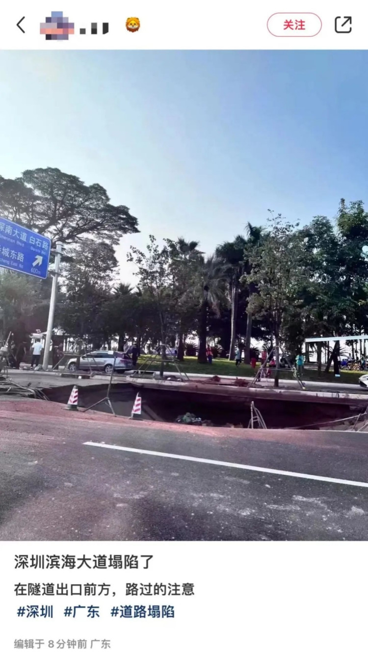 10月12日早高峰,網(wǎng)友報料稱,深圳濱海大道一路段塌陷導致車輛堵塞。