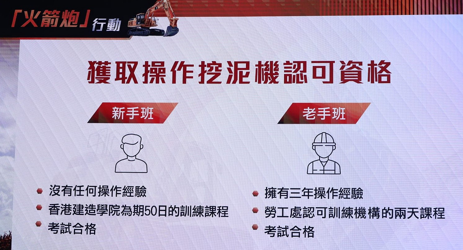根據(jù)法律規(guī)定,無任何操作挖泥機(jī)經(jīng)驗(yàn)的人士,必需參加香港建造學(xué)院開辦為期50日的訓(xùn)練課程,俗稱「新手班」;而操作挖泥機(jī)滿3年經(jīng)驗(yàn)人士,包括境外經(jīng)驗(yàn),可參加勞工處認(rèn)可訓(xùn)練課程營辦機(jī)構(gòu)舉辦的俗稱「老手班」兩天課程,並考試合格才獲有效證書。