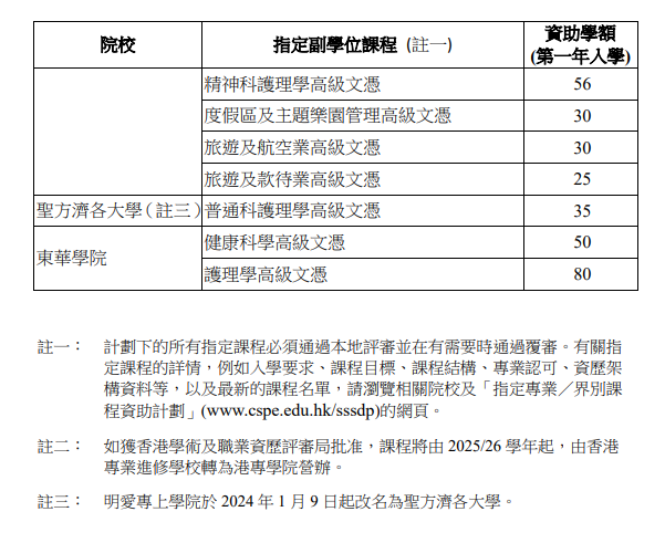 該32個指定副學(xué)位課程屬於七個對人才需求殷切的範(fàn)疇,分別為建築及工程、電腦科學(xué)、創(chuàng)意工業(yè)、護(hù)理、運(yùn)動及康樂、檢測及認(rèn)證和旅遊及款待。有關(guān)課程和學(xué)額數(shù)目經(jīng)教育局諮詢相關(guān)政策局和部門後決定。