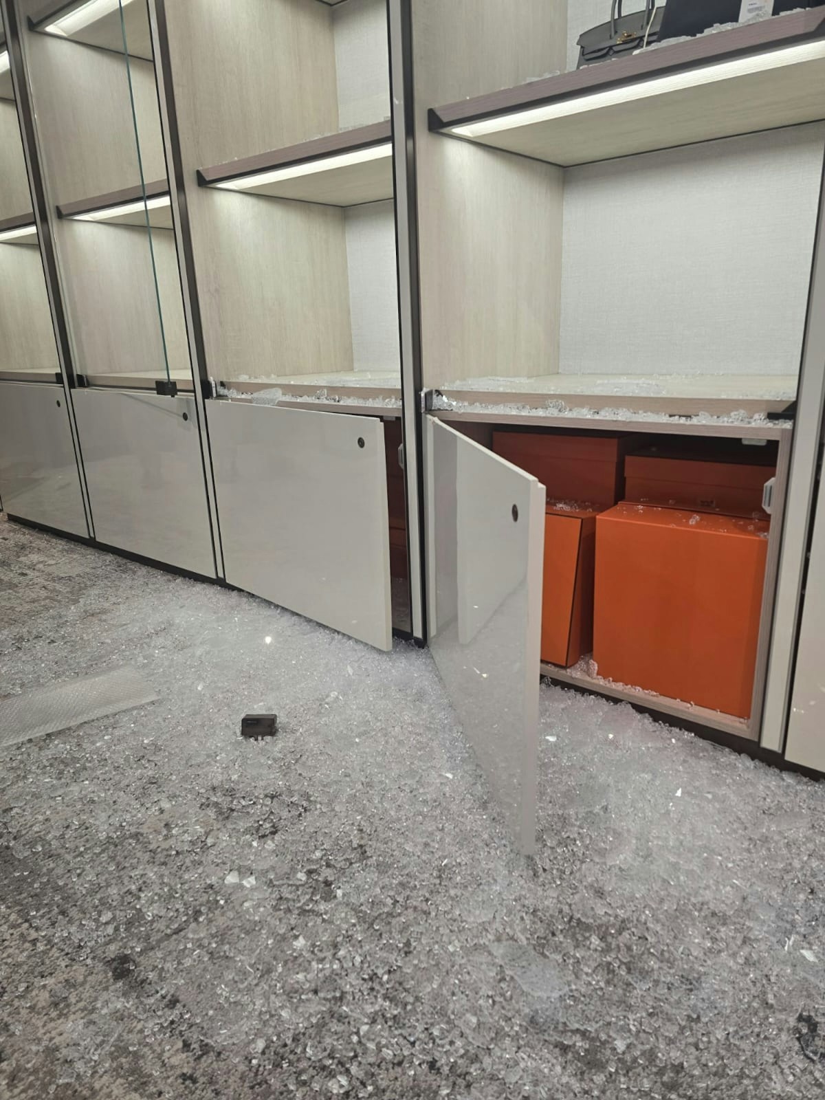 現(xiàn)場(chǎng)可見(jiàn),專(zhuān)賣(mài)店的玻璃門(mén)粉碎,地上遺留一個(gè)疑用來(lái)砸爛大門(mén)的工具。店內(nèi)有一列玻璃飾櫃,放有數(shù)十個(gè)Hermès手袋,惟部分飾櫃的玻璃被打爛,裏面已經(jīng)空了,玻璃碎散落地上,手袋的專(zhuān)屬紙袋被丟在地上。