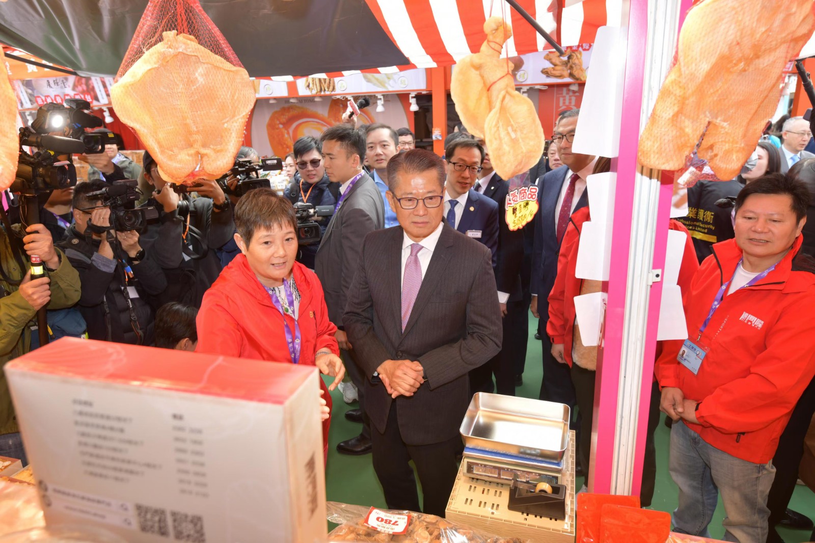 一眾主禮嘉賓在開幕禮後參觀會場,陳茂波到訪不同攤位,購買了鱷魚肉湯包、日本冬菇、香草蘭紅茶、沙爹牛肉乾、炭燒豬肉乾、蛋卷、花生糖、香港海景積木、手挽飯袋、熊貓積木等產品。