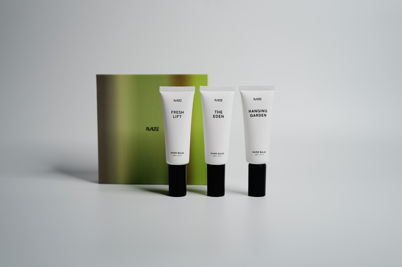 RAZE推出兩款全新香氣Drive in Ashes與Arctic Bulle,新香氣融入水基底香水、香氛蠟燭和室內(nèi)擴香。品牌的生活香氛產(chǎn)品類別,新增了車用香氛座、身體磨砂和護手霜系列,把詩意芳香融入生活中,並提供11款節(jié)日禮品組合套裝。其中護手霜套裝適合冬日,純素配方針對手部肌膚調(diào)配,蘊含2%維生素原B5、乳木果油、甜杏仁油、金盞花萃取物等,可長效保濕和修復(fù)受損肌膚。