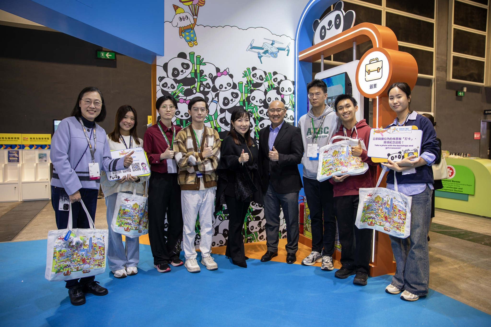頂圖:助理專員李矜持(左二)於灣區(qū)辦在「教育及職業(yè)博覽2025」設(shè)置的攤位擔(dān)任導(dǎo)賞員。
