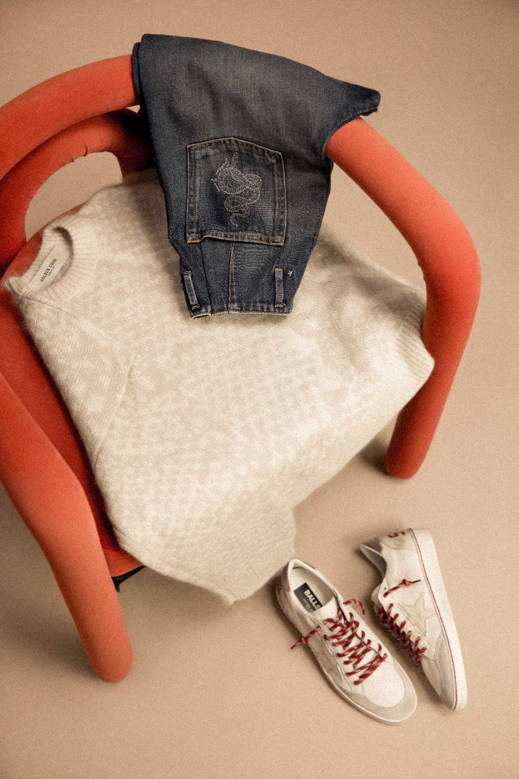 Golden Goose呈獻全新蛇年限定系列,呈現(xiàn)生肖蛇所象徵的智慧、蛻變與永恆。系列巧妙融合當(dāng)代時尚與深厚文化傳承,為節(jié)日季帶來煥然一新的創(chuàng)意視角。中性風(fēng)的水洗牛仔褲,寬鬆版型,後口袋飾有精緻蛇形刺繡圖案,靈動展現(xiàn)節(jié)慶氛圍。米色寬鬆羊毛毛衣採用抽象蛇紋印花,風(fēng)格百搭,適合多種場合。系列主打為煥新演繹的經(jīng)典Ball Star鞋履,以白色皮革巧搭蛇紋印花、紅色縫線及相襯鞋帶,大膽邁向未來。