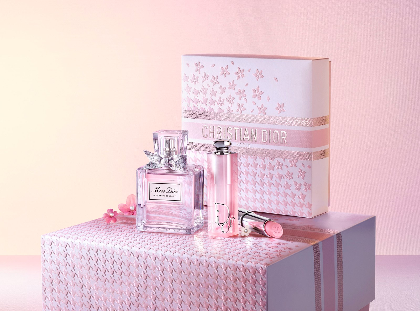 Dior推出情人節(jié)珍藏版的高級訂製時尚套裝,內(nèi)藏Blooming Bouquet淡香薰50ml與誘惑煥彩潤唇膏001 Pink色調(diào)。禮盒飾上化身為精緻花朵和花瓣的粉紅色千鳥格圖騰。淡香薰猶如簇?fù)淼孽r花,散發(fā)清新柔和的香調(diào),配方核心傾注了大馬士革玫瑰和牡丹芳香,並輕裹在白麝香的柔和氣息中。誘惑煥彩潤唇膏能與唇部的酸鹼值產(chǎn)生反應(yīng),煥發(fā)個人化唇色,以清新瑰麗的基調(diào)提升櫻唇光澤。