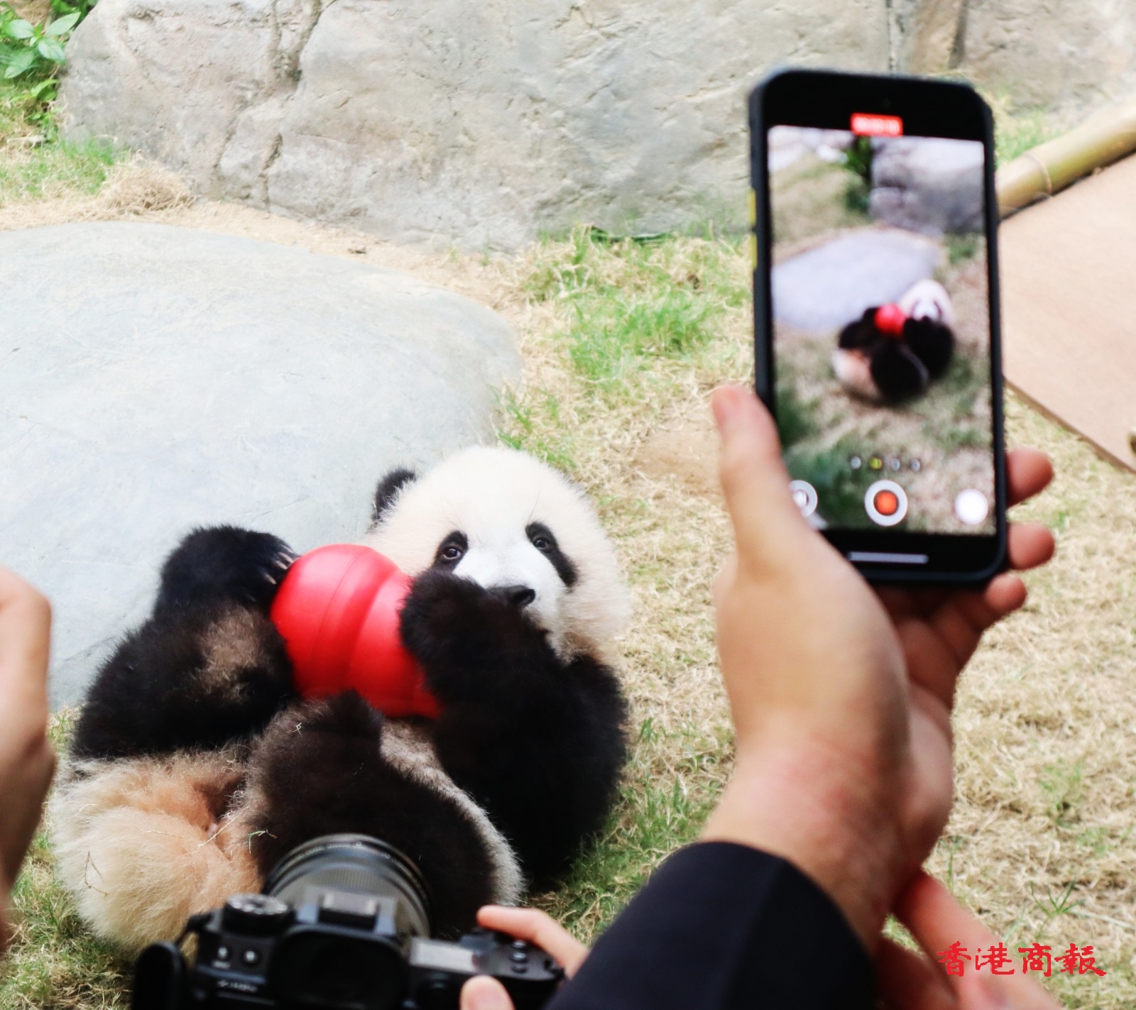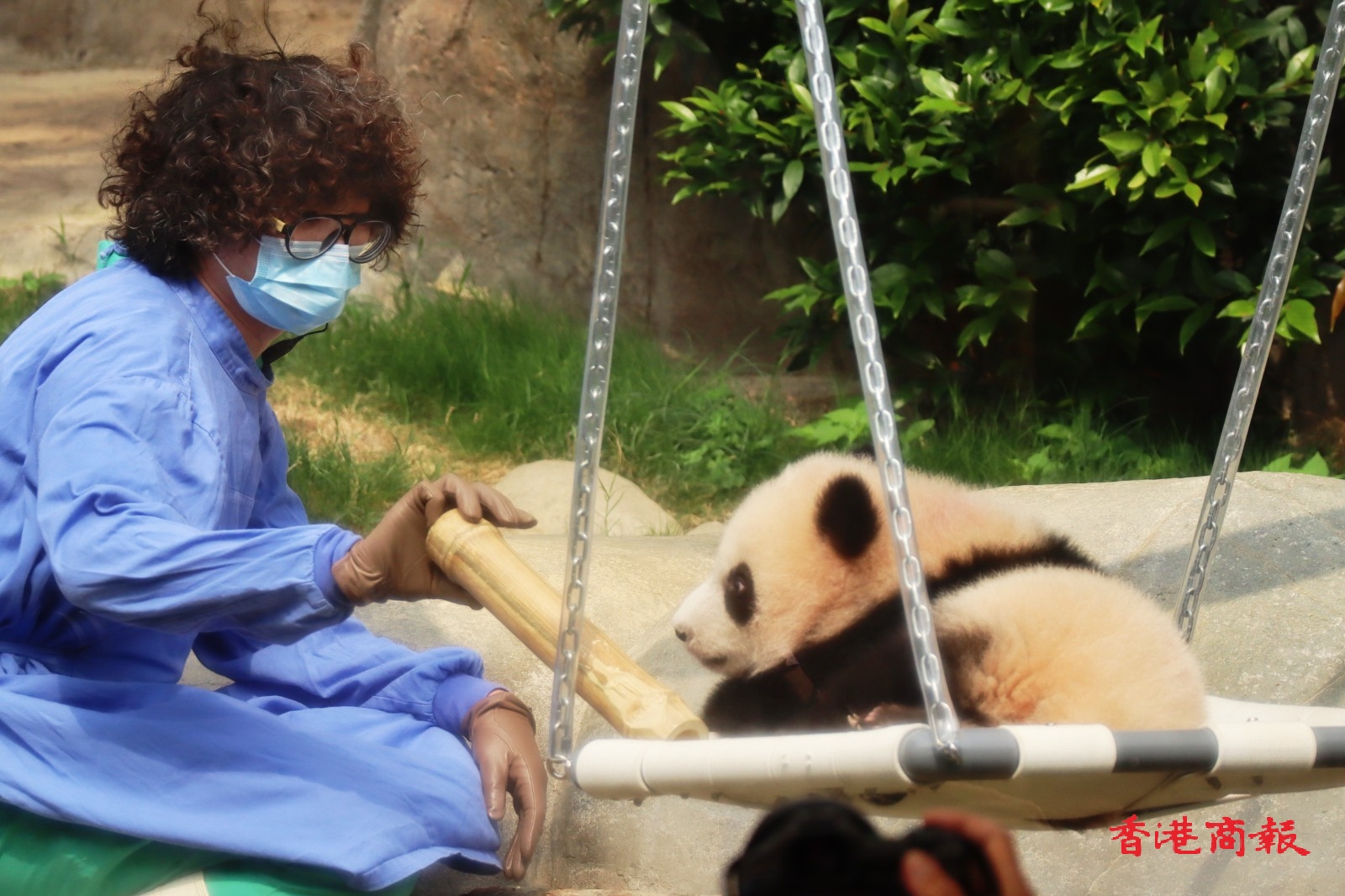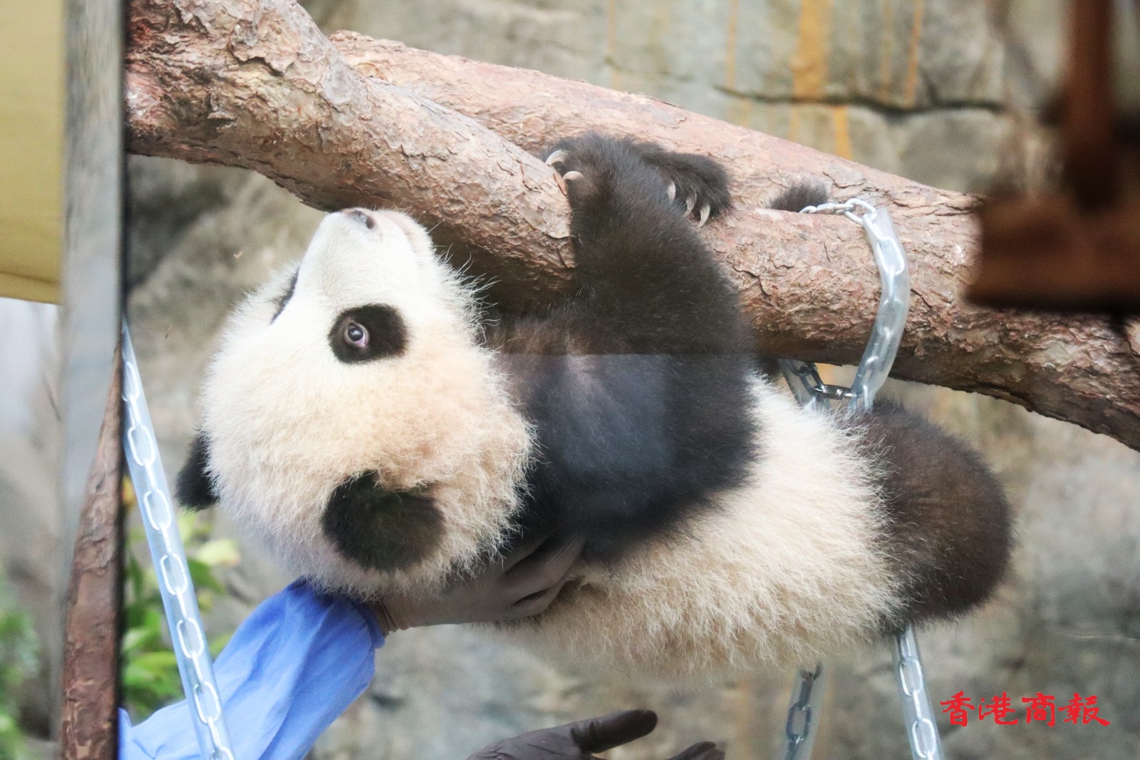 今日園方特別開放傳媒探訪環(huán)節(jié),兩隻大熊貓寶寶十分可愛,「家姐」在滑梯翻滾,還用爪子撥弄懸掛的風(fēng)鈴及枝葉,活力充沛。相較之下,「細(xì)佬」則安靜蜷縮在韆鞦上酣然入夢。(記者 馮瀚文 攝)