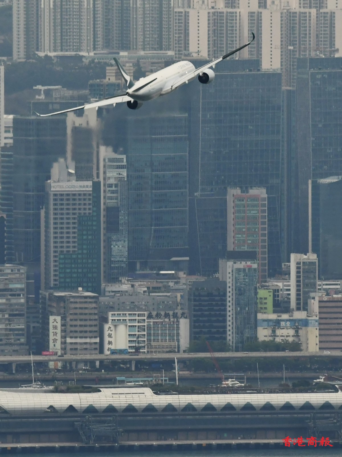 國泰航空CX8100航班在啟德體育園前掠過,重現(xiàn)昔日啟德機場飛機穿越鬧市經典場面。馮瀚文攝