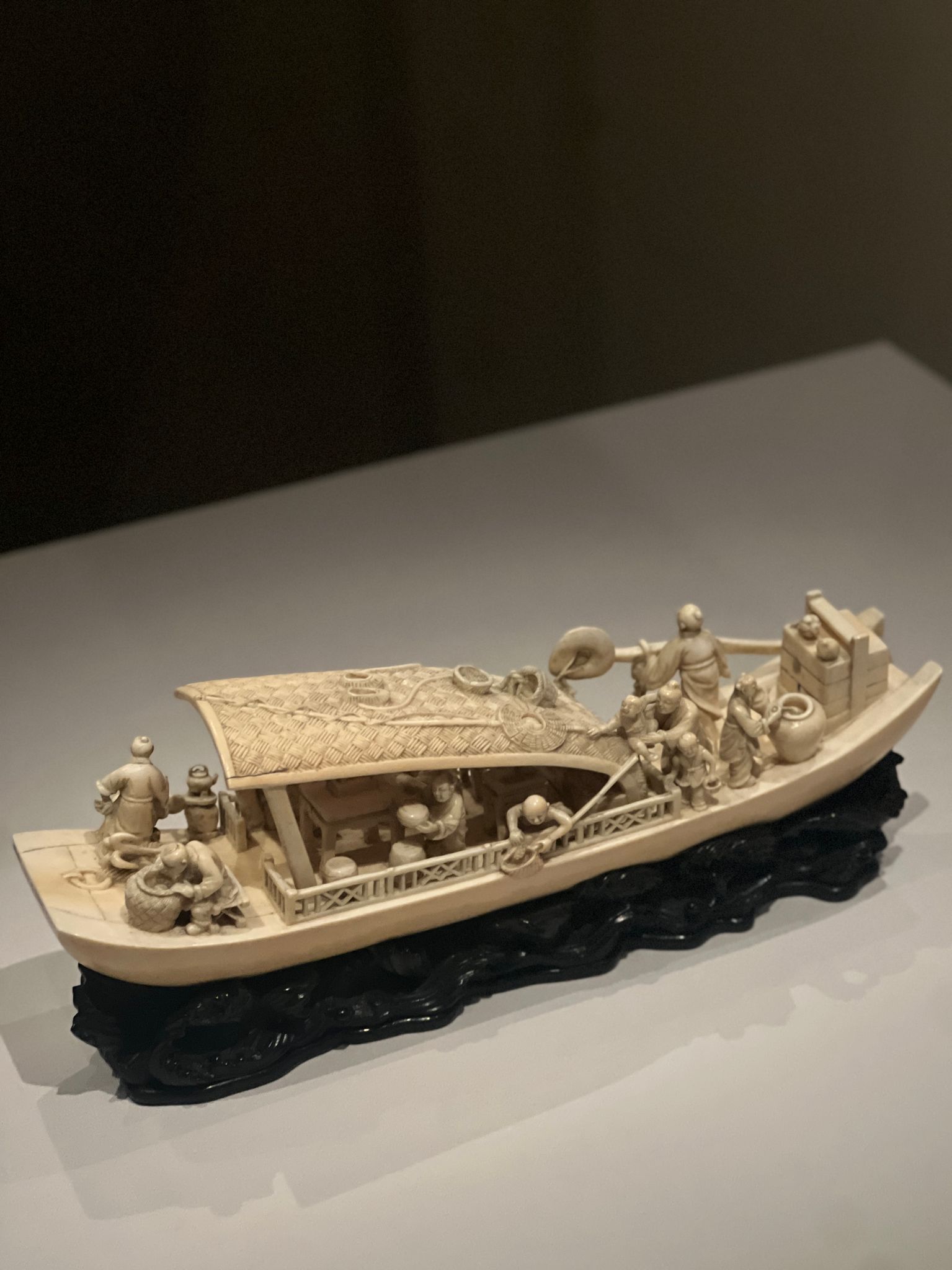 香港融匯多元的飲食文化,例如遊客會(huì)專程到避風(fēng)塘體驗(yàn)在船上享用艇仔粉。蔣得莊表示古時(shí)也有類似的旅遊概念:「明清時(shí)期交通發(fā)達(dá),江南地區(qū)水網(wǎng)密布,遊船宴飲風(fēng)氣興盛。這件由象牙製成的『船』在船尾有多層提食盒,船上有人從水中撈起河鮮、有人扇著茶爐煮茶等,反映當(dāng)時(shí)遊船的樂趣?!拐蛊冯m小,卻生動(dòng)地刻畫了水上遊憩飲食的場(chǎng)景,仔細(xì)觀察還有人正查看簍中的螃蟹,做工精細(xì)。