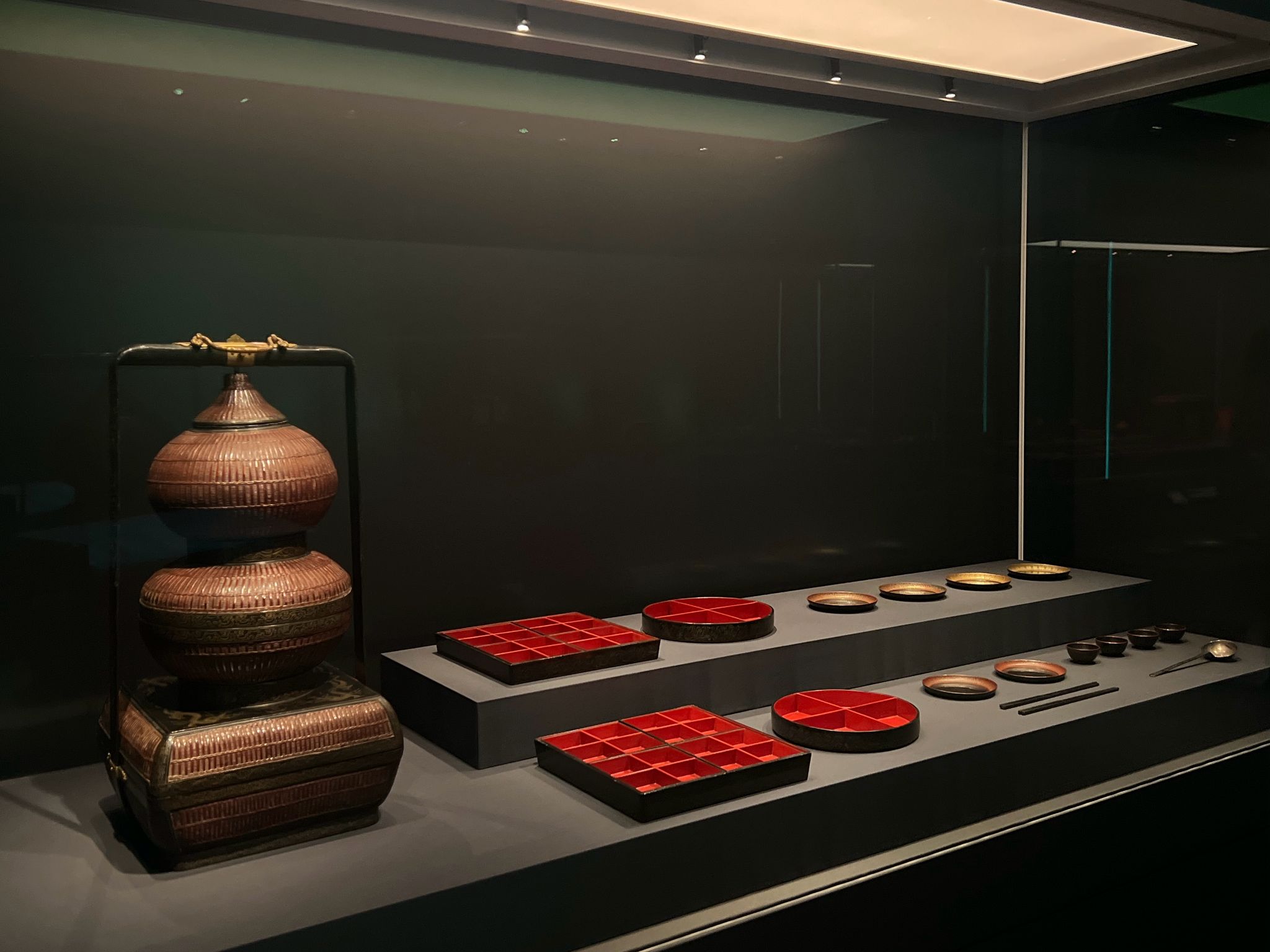 甫入展廳,映入眼簾的是一個(gè)精緻的提盒。香港故宮文化博物館研究員兼策展人蔣得莊向記者介紹,這是清代的「松鶴紋圓提盒」:「紅木製的提盒布滿螺鈿塑造的花紋,枝條、藤蔓等圖案富美感,能看出工藝之精湛?!棺辖莾?nèi),日理萬機(jī)的皇帝並無固定的用餐地方,到用膳時(shí)間,御膳房須將餐具和飯菜送到皇帝身處之地,提盒就是承盛食物與餐具的「外賣盒」。明清時(shí)期,大眾旅遊興盛,這類提盒也常在春天郊遊野餐時(shí)用來盛裝酒菜,設(shè)計(jì)由數(shù)層屜盤組成,有時(shí)盤中帶格,方便放置不同食物,移動(dòng)時(shí)不會(huì)混作一團(tuán)。在展覽中,觀者能欣賞到多種類型提盒,如葫蘆形、方形、圓形。策展團(tuán)隊(duì)也受此啟發(fā),以「移動(dòng)」作為展覽主題,並分為「跨越生死」、「跨越文化」、「跨越山水」展區(qū),以探討飲食器具在精神、文化與空間上的移動(dòng)性。如「跨越生死」展示了陪葬物品「生器」,這些墓葬出土的飲食器物反映了當(dāng)時(shí)人對(duì)飲食文化的重視。展覽呈現(xiàn)的西漢中晚期穀倉、水井、豬舍、屋倉、磨等鉛釉陶明器,代表陵墓主人對(duì)死後依然能夠富足生活的祈求。另一展品、漢代的陪葬品「烤蟬爐」,以低溫鉛釉燒製,爐上放置兩排蟬,反映當(dāng)時(shí)民間有吃蟬的習(xí)俗。