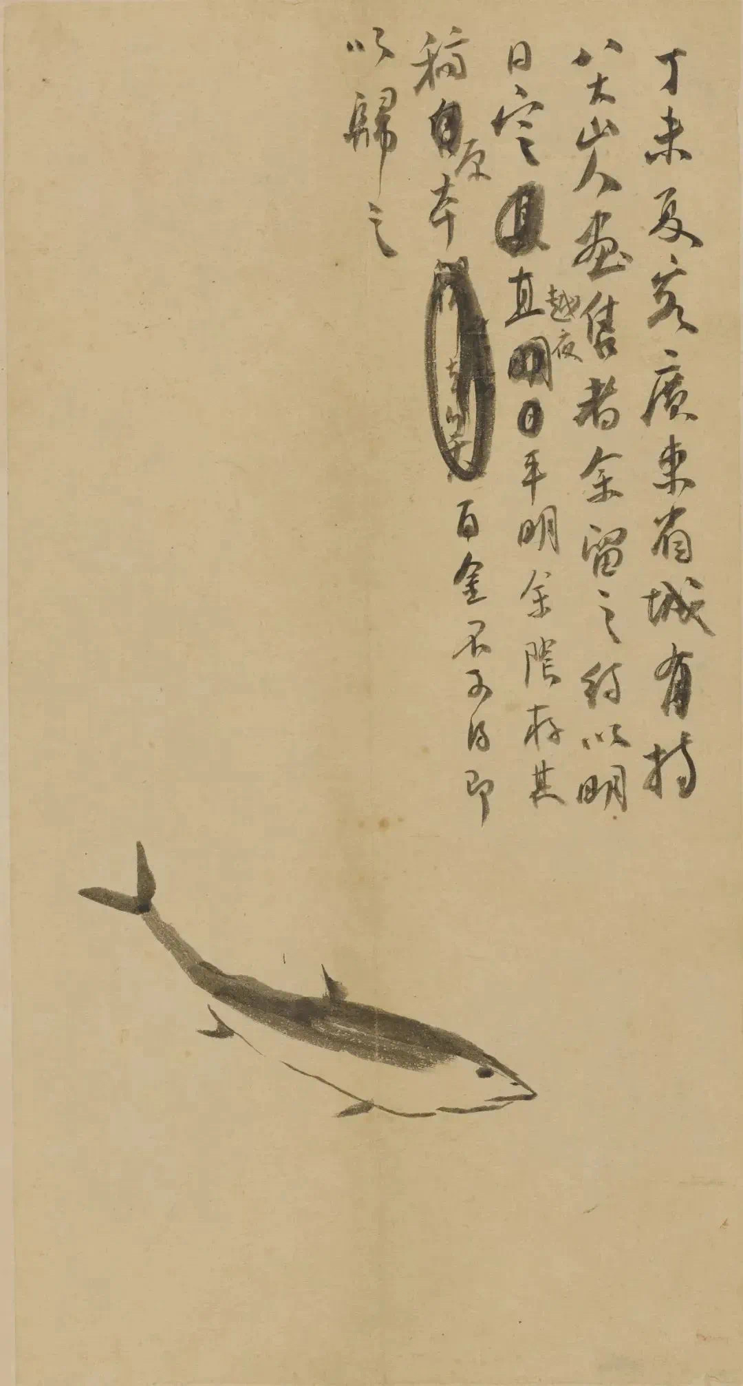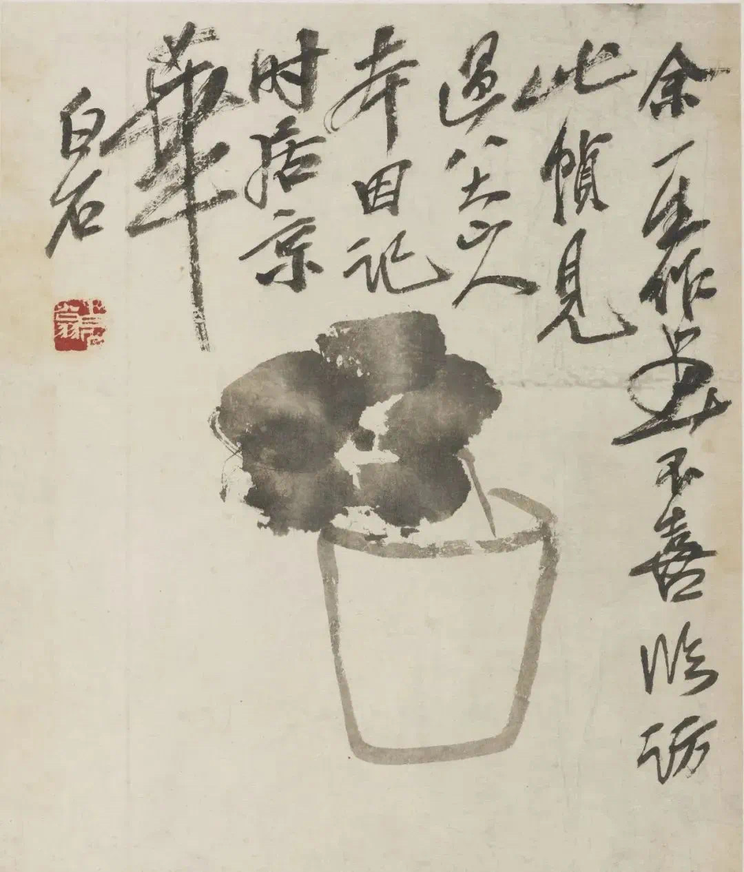 另一側(cè)的齊白石臨清朱耷《瓶花》及《記八大山人畫稿》兩幅作品也頗為引人注目。白石老人還在畫上寫了兩篇「小作文」記錄心路歷程:1907年夏,齊白石客居廣東省城,見街上有人拿著八大山人的畫作在售賣,但是賣「一百金」實(shí)在是太貴了,於是他就悄悄地把這幅作品臨了下來。他又說:「餘一生作畫不喜臨仿,此幀見遇八大山人本,因記?!挂淮髱?,就是這樣帶著自己對八大山人畫作的渴望,向著更高的藝術(shù)層次進(jìn)發(fā)。