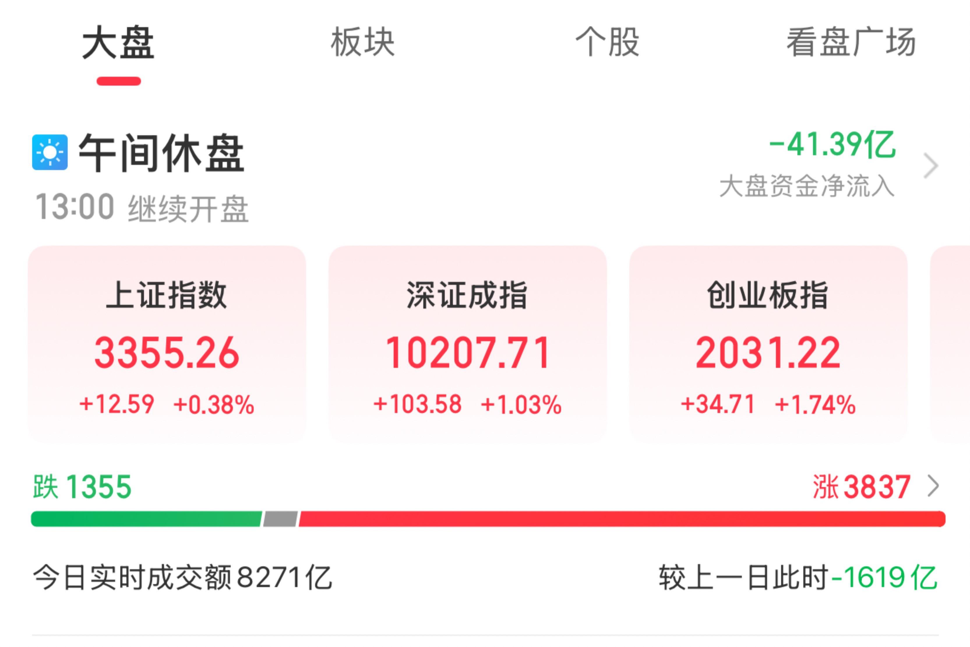 5月8日上午,A股三大指數(shù)延續(xù)震蕩上行態(tài)勢。截至午盤,上證指數(shù)漲0.38%;深證成指報漲1.03%;創(chuàng)業(yè)板指表現(xiàn)最為強勁,收漲1.74%至2031.22點;北證50微漲0.14%。全市場半日成交額8271億元,較上日縮量1619億元,超3800隻個股上漲。