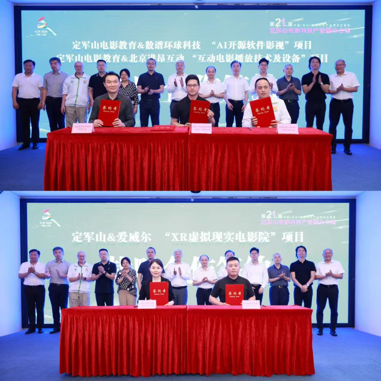 5月23日,第二十一屆文博會定軍山電影科技產(chǎn)業(yè)園分會場盛大開幕,開幕式期間,在現(xiàn)場領(lǐng)導(dǎo)和嘉賓的共同見證下,定軍山電影教育科技(深圳)有限公司、數(shù)譜環(huán)球(深圳)科技有限公司、世第(深圳)影視科技有限公司、廣州聚匯意傳媒有限公司、深圳瀚海光通信科技有限公司、北京進(jìn)昂互動科技有限公司分別就《AI開源軟件影視項目》、《沉浸式5D動感影院項目》、《中小學(xué)影視教育項目》、《人工智能電影AI實踐室》以及《互動電影播放技術(shù)及設(shè)備項目》進(jìn)行合作簽約;定軍山電影公園(深圳)有限公司與愛威爾星空(北京)技術(shù)有限公司就《XR虛擬現(xiàn)實電影院》項目進(jìn)行合作簽約,促成了若干項重大項目戰(zhàn)略合作。