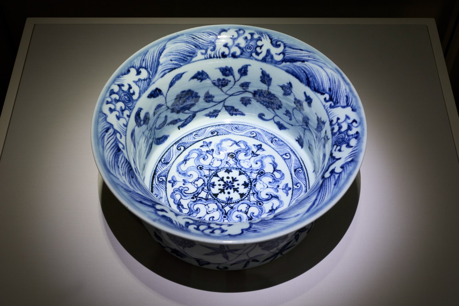 展覽的第一單元介紹了7 世紀(jì)以來伊斯蘭世界與中國的文化交流與互鑒。這種互動(dòng)最早可追溯至唐朝,史學(xué)家杜佑(735–812 年)編纂的《通典》中,曾提及伊斯蘭教創(chuàng)立人先知穆罕默德(約570–632 年)。7世紀(jì)中期,穆斯林商人的海上貿(mào)易活動(dòng)對中國南方的經(jīng)濟(jì)產(chǎn)生巨大影響。兩地在藝術(shù)上結(jié)下深厚的不解之緣。中國藝術(shù)中的雲(yún)、蓮花、龍等紋路,成為伊斯蘭繪畫、陶瓷、地毯等藝術(shù)品中的重要紋飾,中國工匠也受到伊斯蘭藝術(shù)的啟發(fā),比如展廳中的明永樂青花纏枝蓮紋折沿盆,造型源於於馬穆魯克時(shí)期(1250–1517年)的伊斯蘭金屬或玻璃器物,內(nèi)部底座裝飾有六角星,六角星是伊斯蘭世界常見的圖案。據(jù)說這顆星有時(shí)被稱為「所羅門印章」,被刻在所羅門王的戒指上。
