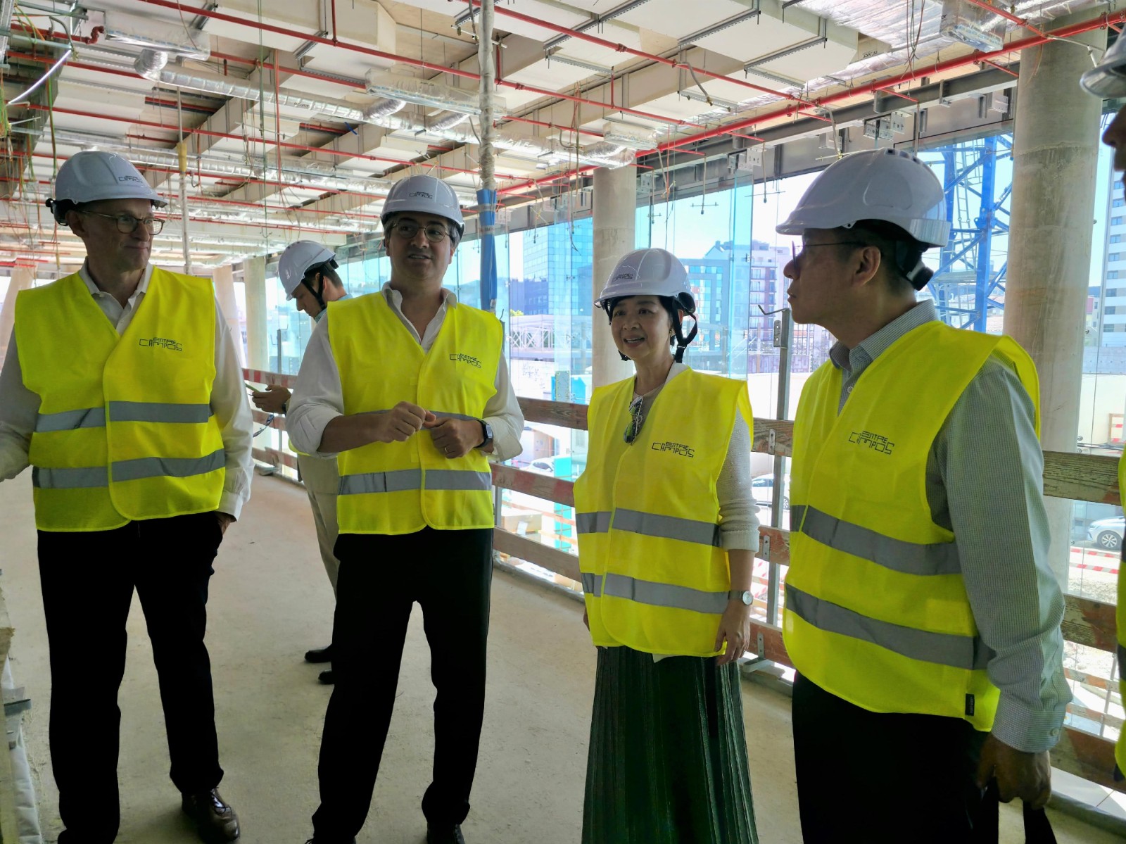 何永賢(左一)參觀當(dāng)?shù)匾粋€(gè)由公私營(yíng)合作發(fā)展,包含以中產(chǎn)住戶為對(duì)象的社會(huì)房屋、辦公室、零售、社區(qū)設(shè)施和綠化空間的重建項(xiàng)目EntreCampos。政府新聞處