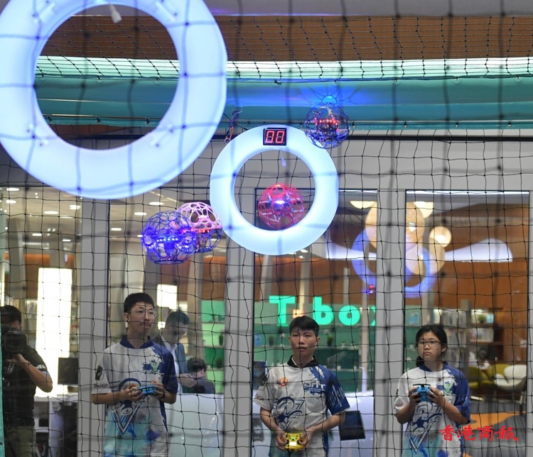 頂圖圖説:中國香港無人機(jī)總會主席楊景賞(中)與無人機(jī)運(yùn)動員。