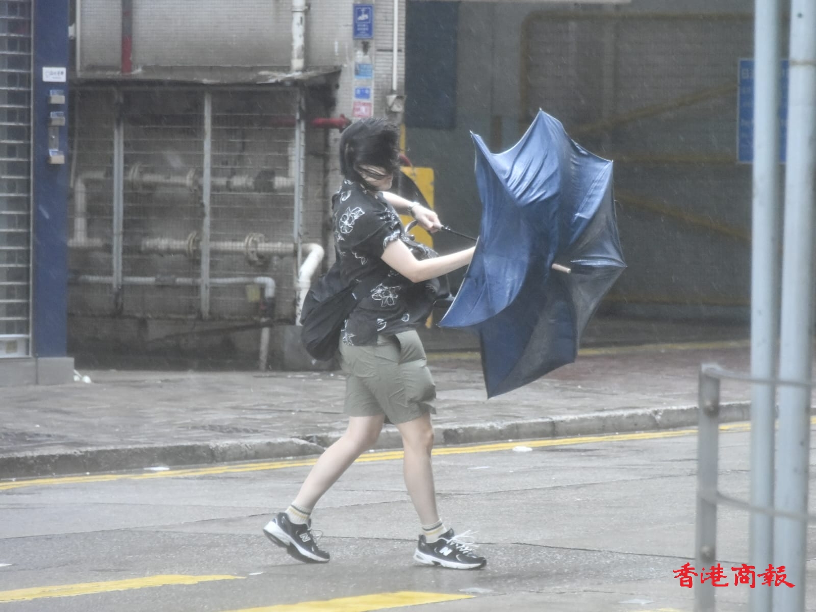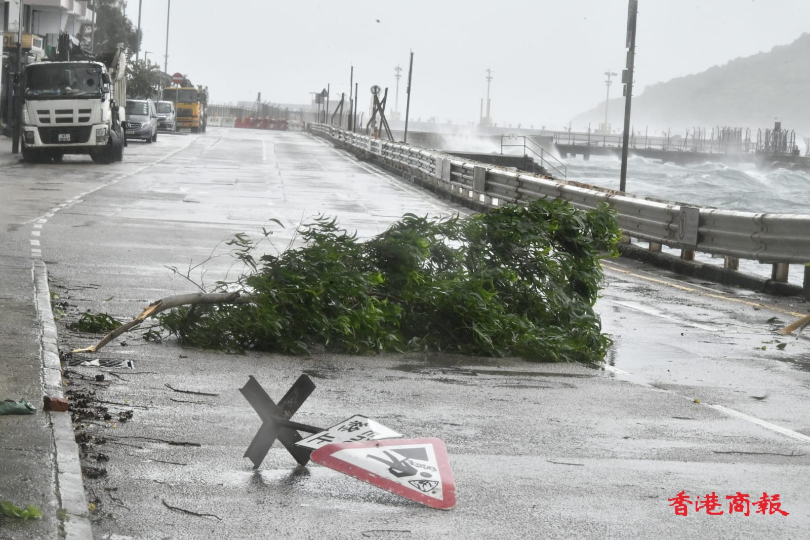 在西環(huán)海傍一帶,不時(shí)有湧浪拍打岸邊,亦有樹木倒塌,橫跨兩條行車線,有市民外出放狗,亦有市民顯得較為狼狽,打開雨傘被強(qiáng)風(fēng)吹翻。有餐廳則如常開門營(yíng)業(yè),給食客有「醫(yī)肚」的選擇。(記者 葉家亨 / 攝影 蔡啟文)